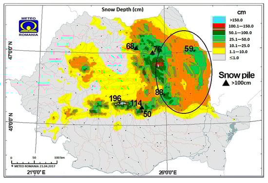 The blizzard produced in eastern Romania around 20 April 2017 was extreme, especially due to the devastating effects on the vegetation, its occurrence taking place in the second half of the spring. In this case, the wind gusts generally reached speeds of 60–70 km h−1 and the abundant snowfall led to the deposition of a wet consistent snow cover in most parts of Moldavia (up to 59 cm thick at meteorological stations; Figure 3). Some weather stations recorded the largest snow cover of the winter season that ended [21].