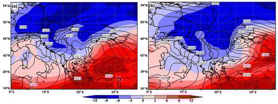 In Figure 17, it can be seen that the east Romania cyclones develop (Figure 17a–c) when the advection of cold air reaches southernmost latitudes, while occlusion cases (Figure 17d–f) correspond to a locking of the cold transport towards Romania at northern latitudes.
