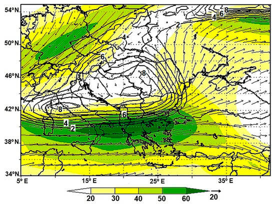 At upper levels, Romania was under the influence of a baroclinically unstable polar jet, with Rossby wave breaking under interaction with a positive potential vorticity (PV) anomaly, moving from the Mediterranean to the Black Sea (Figure 5). Moreover, a tropopause fold can be identified in Figure 6 and Figure 7a, above the area where the low-level cyclone developed. The upward movements generated east of the tropopause folding, and at the left exit of the jet streak played an important role in the amplification of the low-level cyclone, as will be shown below (Figure 7).