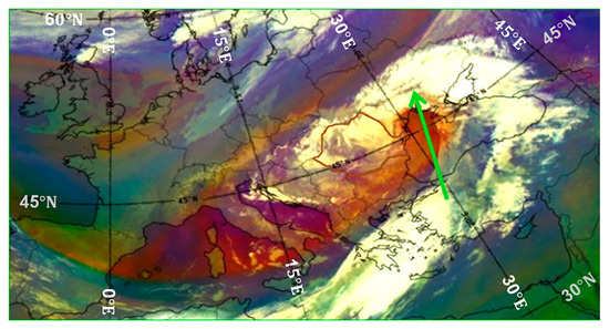 A very useful “tool” to identify cyclogenesis is RGB Air Mass satellite image. This is because, by enhancing temperature and moisture characteristics of air masses, it offers the possibility of quick and easy identification of the jet stream (transition zone from blue to red colors along the frontal cloudiness), and the descending stratospheric air with high potential vorticity (reddish color) (Figure 6) [44].