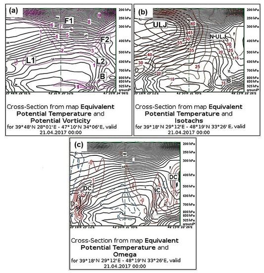 Vertical cross-section in the direction of the green arrow from the Figure 6 at 00 UTC 21 April 2017: (a) PV (pink lines, (PVU)), L1, L2: the two PV lobes in the troposphere (see text); F1, F2: tropopause folds (see text); B: lower-troposphere baroclinic area (see text), (b) isotachs ((m/s), interval 5 m/s, brown line), ULJ: upper level jet’s southern (main) streak, N-ULJ: upper level jet’s northern (secondary) streak (see text), (c) omega ((Pa/s), interval 1 Pa/s, red lines—ascending movements, blue line—descending movements). In all images, black lines show equivalent potential temperature (K, interval 2 K) (obtained using ePort, EUMeTrain product–copyright EUMETSAT). DC0 is the main tropopause fold; DC and IC are the tropospheric–ageostrophic circulations linked to the two jet streaks. (Note (a) has a slight shift of the vertical section compared to (b) and (c) due to different grids in computing variables.)