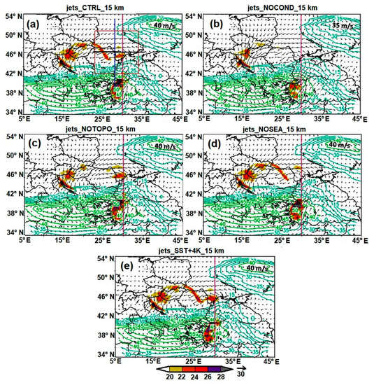 Isotachs at 300 hPa (m/s) (U wind component), green light lines more than 40 m/s, and blue light lines less than 40 m/s (starting with 15 m/s, every 5 m/s), 850 hPa wind (vector), LLJs (magnitude >20 m/s—shaded as indicated on the color bar). For: (a) CTRL (Control run, Table 1), (b) NOCOND (simulation without condensation, Table 1), (c) NOTOPO (simulation with topography high reduced below 200 m over Romania, Table 1), (d) NOSEA (simulation without Black Sea, Table 1), (e) SST + 4 K (simulation with sea surface temperature increased by 4K, Table 1), valid at 12 UTC 20 April 2017. In (a): dark blue line—direction of the vertical cross section (see text); red dotted line—landmark for N-ULJ position, indication for the 30° E; transparent square—area of ageostrophic circulation, andblack line—location of LLJs joint.
