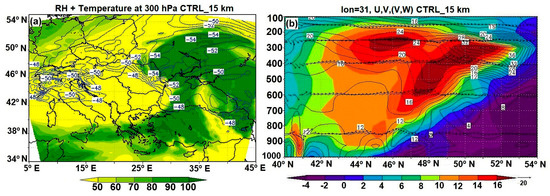 (a) 300 hPa relative humidity (%) (shaded as indicated on the color bar) and temperature (°C, dotted lines, every 1 °C), CTRL run; Ox axis: latitude; Oy axis: longitude. (b) Upward vertical velocity ((V,W), arrows, (m/s), W was multiplied by 100); horizontal wind magnitude ((m/s), shaded as indicated on the color bar); wind magnitude (m/s), contour each 2 m/s in CTRL from 850 to 400 hPa conducting to a mid-level jet (at 600–400 hPa, 48° N) and a secondary N-ULJ (at 300 hPa, 51° N)— 12 UTC 20 April 2017; Ox axis: latitude; Oy axis: pressure levels (hPa).