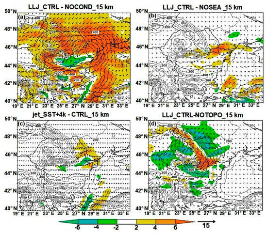 The role of the sea (CTRL-NOSEA experiment) can be seen in Figure 8d and Figure 10b. The main response comes from the breeze circulation that strengthens the IC-LLJ along and north of the Black Sea Romanian coast (Figure 8a vs. Figure 8d). The SST anomaly (SST + 4 k versus CTRL) influences are significant on the IC (warmer SST for both the Mediterranean and Black Sea creates stronger thermal coastal gradient), but this also strengthens the DC-LLJ (Figure 8e and Figure 10c) by a farther northward advancement, so it favors a more vertically developed ageostrophic circulation. The way in which local thermo-dynamics (circulation, thermal gradients) are driven by sea and SST is further discussed in the sub-Section 3.2.3.