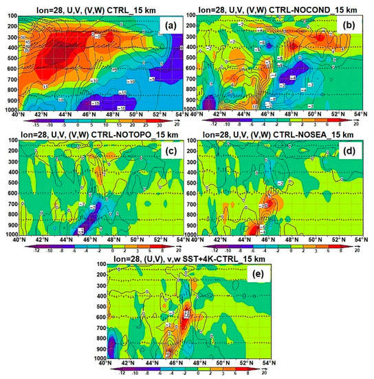 Vertical cross section (along the dark blue line in Figure 8a): zonal wind (U (m/s), contour lines, interval 2 m/s), meridional wind (V (m/s), shaded as indicated on the color bar), and the ageostrophic circulation (V,W) (vector, (m/s), W was multiplied by 100) at 28° E for the (a) CTRL, (b) CTRL-NOCOND, (c) CTRL-NOTOPO, (d) CTRL-NOSEA, and (e) SST + 4 K-CTRL, for 12 UTC 20 April 2017. Ox axis: latitude; Oy axis: pressure levels (hPa).
