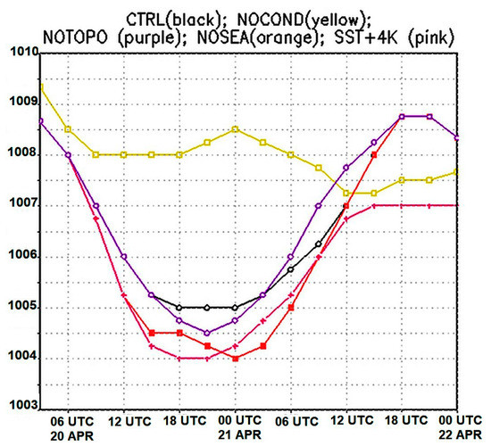 The time evolution of the minimum surface pressure in the area [20° E–35° E, 36° N–51° N] is shown in Figure 12. The first thing to be noticed is that the condensation process has the greatest impact on the deepening of the cyclone, inducing a pressure deepening of 3.5 hPa. The other triggers induce smaller differences to CTRL, between 1 and −1 hPa. We note, in particular, the opposing effect of the sea and warmer SST on the deepening. As discussed, a shallow, local development triggered by coastal circulation inhibits deep vertical convergence and surface pressure deepening. Over sea, another contribution might be supplied by lower roughness for the pressure increase in CTRL compared to NOSEA.