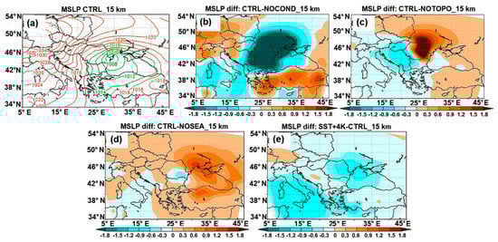 (a) mean sea level pressure mean (hPa) (CTRL, contour interval 2 hPa); (b–d) the difference in mean sea level pressure mean from each process: (b) CTRL-NOCOND; (c) CTRL-NOTOPO; (d) CTRL-NOSEA; (e) SST+4K-CTRL. The mean is from 06 UTC 20 April to 06 UTC 21 April 2017. All fields are shaded as indicated on the color bar.