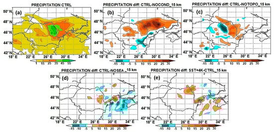 These result in a significant contribution to the total precipitation (up to 28%, in the area of precipitation maxima—Moldavia; Figure 14c) due to the presence of topography.