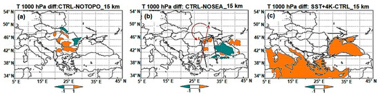 Difference of air temperature at 1000 hPa (shaded as indicated on the color bar): (a) CTRL-NOTOPO, (b) CTRL-NOSEA (black arrows indicate cyclonic/anticyclonic pressure anomaly westwards/eastwards of the coast (seen in Figure 13d); also a cyclonic rotation (red curve) of the southwest–northeast advection (red arrow) results due to the presence of the Black Sea (see text); (c) SST+4K-CTRL. All are averaged from 06 UTC 20 April to 06 UTC 21 April 2017 (K). Note the large–regional signal of cyclonicity potential over the Carpathian basin generated by thermal wind when SST anomalies (Mediterranean and Black Sea) are positive (arrows in (c)).