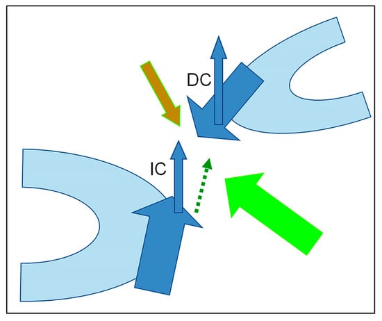 Schema of the mechanism: Jet streak (light blue), LLJs (dark blue), ageostrophic circulations (IC, DC, upward branches—blue thin arrows); humidity advection (dark green thin—lower levels, light green thick—upper levels); topographic forcing (brown).