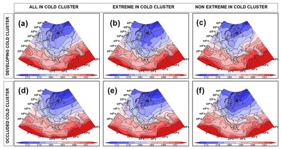 Stratification of cold events (1000 hPa temperature (K, contour interval 2K) mean shaded as indicated on the color bar). Top: cold-developing (all) (a); cold-developing extreme (b); cold-developing below-average (c). Bottom: Cold-occluded (all) (d); cold-occluded extreme (e); cold-occluded below-average (f).