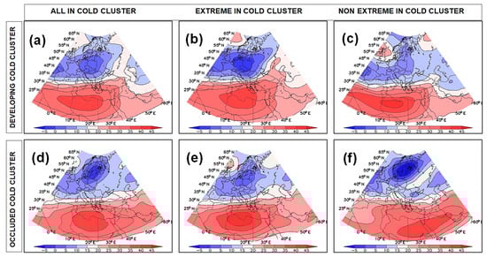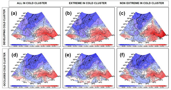 Regarding the moisture (Figure 18), it can be observed that the situations with significant southwesterly advection of humidity sourced over the central–eastern Mediterranean [30° N–32° N, 10° E–20° E] lead to developing cyclones (Figure 18a–c), while those with dryer air over this storm track source area for southeast Europe in April [54] result in occlusion (Figure 18d–f). Enhanced moisture over the Mediterranean source area is also required for extremes to occur; we note the extreme/non-extreme sub-classes are over/below average of the class’s humidity amount in the area, and this feature is present for both developing and occluding classes for cold cases (Figure 18).