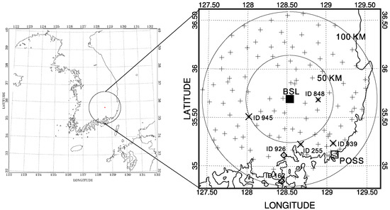 Rainfall amount measured by gages of the 0.5/0.1 mm tipping-bucket type operated and managed for data quality by the Korea Meteorological Administration (KMA) were used to examine the performance of polarimetric radar rainfall relations as a function of precipitation type. Figure 1 shows the location of all instruments used in this study, including the Bislsan radar (BSL) and the POSS (Precipitation Occurrence Sensor System; a more detailed explanation can be found in Sheppard, [30]) disdrometer located ~82 km away from the BSL. Gage sites used for calculating rainfall amount and verifying the classification are also shown. Rain gages installed within the observational range from 5 to 95 km of the radar center are used in this study.