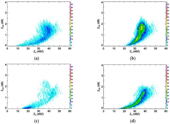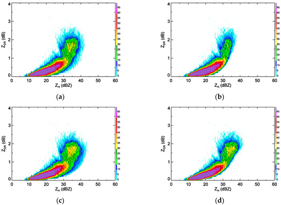 The cumulative occurrence plot of ZH and ZDR for classified as stratiform rainfall, as calculated from rainfall rate temporal variability (a) BR03, (b) logN0-R relation, (c) logNw-D0 relation, and (d) Λ-R relation. The bin size of ZH and ZDR is 1 dBZ and 0.1 dB.