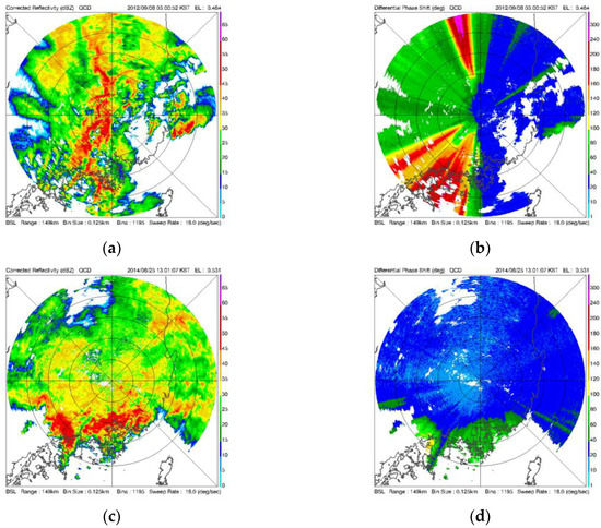 The plan position indicator of (a) ZH and (b) ΦDP at an elevation angle of 0.5° on 03:00 LST 8 September 2012 and (c) ZH and (d) ΦDP on 13:00 LST 25 August 2015.