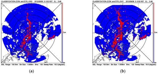 To understand the performance of the classification obtained by DSDs, the reflectivity texture-based method proposed by ST95 was employed. Figure 5 shows the precipitation types classified using DSD-based and ST95 methods on 03:00 LST 8 September 2012 and 13:00 LST 25 August 2014. The blue (red) color shows the regions classified as stratiform (convective). Both methods classified the regions with stronger reflectivity and higher ΦDP gradient very well. However, in isolated regions ST95 classified more rainfall types as a convective than the DSDs method. This is consistent with Penide et al. [17], who found that the texture-based approach seems to classify too many points as convective, when compared with the DSD-based method. For this reason, the DSD-based method was applied to rainfall estimation in this study.