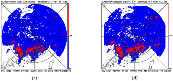 The classification of precipitation types using (a,c) DSD-based and (b,d) SHY method on 03:00 LST 8 September 2012 and 13:00 LST 25 August 2014, respectively. The blue (red) color shows the regions classified as a stratiform (convective).
