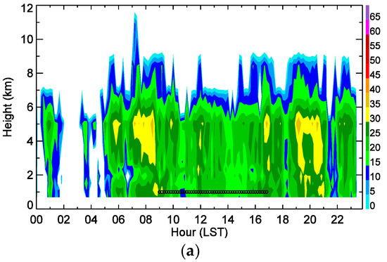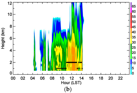 To determine the accuracy of the DSD-based method, the vertical profile of reflectivity was obtained and the precipitation types were extracted at the position of two gage sites as shown in Figure 1. Figure 6 shows the vertical profile of reflectivity extracted from the PSN radar at the position of gage ID 162 on 23 August 2012 and gage ID 926 on 25 August 2014. The asterisks (open circles) on the image show convective (stratiform) rainfall determined by retrieved DSD from observed polarimetric variables using Equation (15) during the analyzed period. On 23 August 2012, the bright band occurred around a height of 5 km during the analysis period and the DSD-based method classified the rainfall as stratiform for the entire analysis time. The peak of the bright band occurred at a height of 4 km from 09:00 LST to 10:00 LST and weak reflectivity (less than 30 dBZ) dominated the entire height range (Figure 6a). The bright band disappeared from 10:00 LST to 11:00 LST and then the echo top of stronger reflectivity around 35 dBZ extended to a height of 6 km at 12:00 LST. The classification performed very well in both stratiform and convective periods except from 13:00 LST to 14:00 LST (Figure 6b).