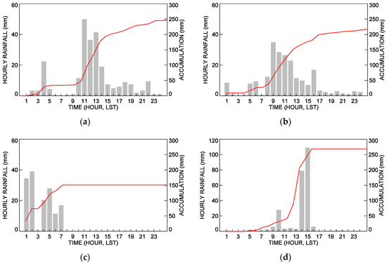 The highest hourly and accumulated rainfall amounts recorded at (a) Geumcheon (ID 848) on 9 July 2011, (b) Daebyung (ID 945) on 23 August 2012, (c) North Changwon (ID 255) on 8 September 2012, and (d) Geumjeong (ID 939) on 25 August 2014. Left (right) axes and grey filled bars (red lines) show hourly (accumulated) rainfall amount (mm).