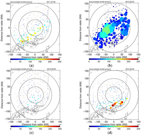 The spatial distribution of accumulated rainfall amounts recorded at rain gages within radar coverage (a) on 9 July 2011, (b) on 23 August 2012, (c) on 8 September 2012, and (d) on 25 August 2014.