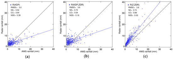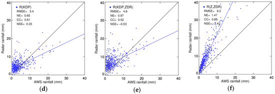 The RMSEs of R(KDP), R(KDP,ZHR), and R(Z,ZDR) with (without) classification were 3.0 (3.4) mm h−1, 3.6 (4.8) mm h−1, and 3.8 (8.2) mm h−1, respectively. The NEs of each relation with classification were 0.52, 0.7, and 0.74, respectively. The scores of NEs without classification of R(KDP), R(KDP,ZDR), and R(Z,ZDR) were 0.65, 0.97, and 1.47, respectively. In this analysis, all relations with classification performed better than those without classification. The most accurate rainfall estimation was obtained from R(KDP) with classification, while the most improved rainfall estimation due to classification was obtained from R(Z,ZDR) (Figure 9).