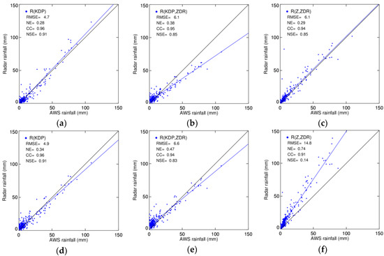 Scatter plots of hourly gage rainfall against rainfall amounts obtained from the radar rainfall relationships (a,d) R(KDP), (b,e) R(KDP,ZDR), (c,f) R(Z,ZDR) with and without classification on 23 August 2012, respectively. Nash–Sutcliffe efficiency (NSE).