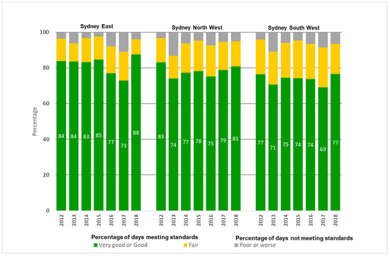 Percentage of days that the Air Quality Index (AQI) rated as ‘very good’ or ‘good’; ‘fair’; and ‘poor’ or worse, in different regions of Sydney between 2012 and 2018 [14].