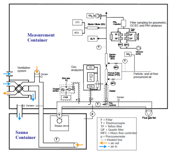 The sauna stoves, which were placed in the sauna room of the sauna container, were operated in a manner that represents normal everyday use. Draught in the flue gas stack was set to 6 Pa at ignition and was allowed to increase naturally as the stack became hot during combustion. Ventilation in the sauna room was set to an air change rate of three times per hour before the experiment. The flow rate of the outgoing air was measured with a TSI LCA301 rotating vane anemometer, and the flow was adjusted by controlling the exhaust duct fan speed. The sauna room volume was 16 m3, so the flow rate of the outgoing air was set to 13.3 dm3/s. Incoming air flow was also adjusted so that the pressure difference between the sauna room and flue gas duct before adjusting the draught was 0 Pa, and there was no air flow through the sauna stove (see Figure 1). The doors to the air-tight sauna container were kept closed during experiments, so air exchange could be monitored and controlled.