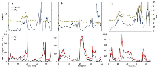 Real-time curves of PM1:BC ratios and absorption Ångström exponent (AAE) of (a) S1_18, (b) S7_11, and (c) S8_28. Note the logarithmic scale of PM1:BC and changing scales of PM1 and BC. PM1 values are instantaneous mass concentrations (electrical low pressure impactor—ELPI) normalized with the average filter concentration for each experiment.