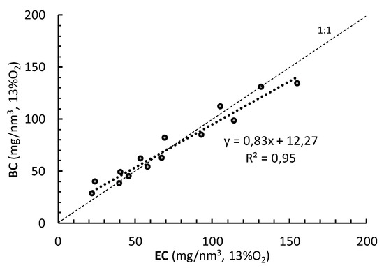 A good correlation between BC and EC concentrations (Figure 4) is observed, indicating that both parameters can be used in the estimation of emissions. At low concentrations, BC values are generally higher than EC, but at higher concentrations the opposite is true. We found no clear explanation for this anomaly in our data. Organic coatings on BC cores should enhance absorption [42], but there was no correlation between organic content and BC:EC ratio in this study. However, Cappa et al. [43] found coatings to have a neglectable effect on absorption enhancement, indicating that enhancement is also dependent on the emission source. It is also possible that the real-time filter loading correction of the Aethalometer [44] could not compensate for the high loadings achieved when measuring stoves with high emissions. The automatic tape advance function was turned off for these experiments to avoid gaps in concentration data during measurements, and thus the filter loadings during some experiments were significantly higher than intended by the manufacturer. There are also uncertainties regarding the thermal-optical carbon analysis, especially the separation between OC and EC [45].