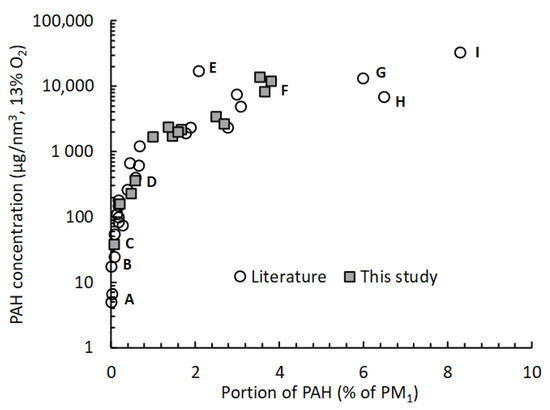 PAH concentration as a function of portion of PAH of PM1 in literature. A: Pellet appliances [9,50]; B: Modern masonry heater [10] and modern log wood boiler [50]; C: S1_18; D: Modern wood-fired chimney stoves (WS) [37,50]; E: Smoldering combustion [51]; F: S2, S6, and S8_11; G: Sauna stove, field experiment [10]; H: Old wood stove [50]; I: Sauna stove [9].