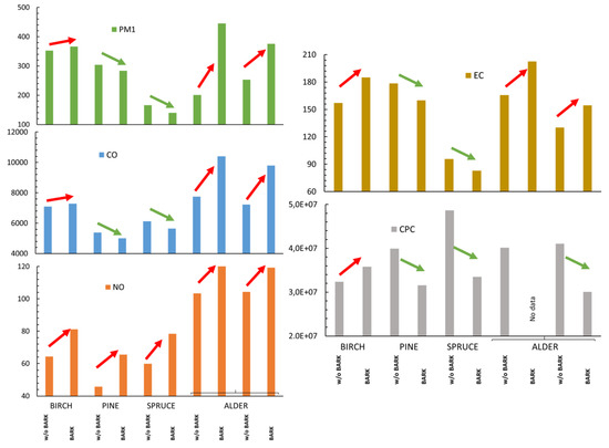 The effects of wood species and bark on the emissions (#/cm3 (number) and mg/Nm3 (other compounds) normalized to 20 °C, 1 atm, and 13% O2). Tests duplicated with alder due to inadequate data in first test round. Red arrow: emission higher with bark than without (w/o) bark; green arrow: emission lower with bark than without bark.