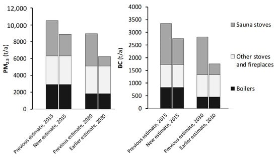 We estimated that the share of modern sauna stoves would be 15% in 2015 and 97% in 2030. Using the projected wood consumption presented in Savolahti et al. [8], we recalculated the PM2.5 and BC emissions from SS for 2015 and 2030 (Figure 7). The new estimate for PM2.5 emissions was 39% lower than the previous one, mainly due to the changed emission factor of conventional sauna stoves. New projection for PM2.5 emissions in 2030 was 71% lower than the previous one, since most of the conventional sauna stoves were assumed to be replaced by modern sauna stoves by then.