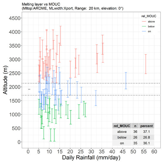 To quantify the dilemma of the altitude positioning for the Mont Moucherotte radar (MOUC radar hereafter), Figure 1 displays the altitudes and vertical extents of the ML as a function of the cumulative rain amounts in the Grenoble valley, for all the precipitation events surpassing a cumulative amount of 5 mm during the years 2016 and 2017. For this preliminary study, the ML top altitudes were approximated by the isotherm altitudes predicted by the Météo-France Numerical Weather Prediction Model (NWP) model AROME at 12:00 UTC. The ML widths were derived from the statistics presented hereinafter and the rain total amounts were derived from raingauge measurements made at IGE (Institute for Geosciences and Environmental research), down in the Grenoble valley. The ML altitude intervals are coloured as a function of their position with respect to the detection layer of the MOUC radar at 0°-elevation angle, up to a range of 20 km (above: red; within: blue; below: green). From this analysis, one can keep in mind that for a rainfall threshold of 5 mm/day, the ML is below (within, resp.) the MOUC detection domain for 26.8% (36.1% respectively) of the cases, i.e., a total of about 63% of problematic cases in terms of possible influence of the vertical structure of precipitation on QPE. Interestingly, these figures do not vary too much as a function of the rain threshold, e.g., for a threshold of 20 mm/day, we observe 26.9% (34.9% resp.) of green (blue respectively) cases, i.e., a total 61.5% of potentially problematic cases.