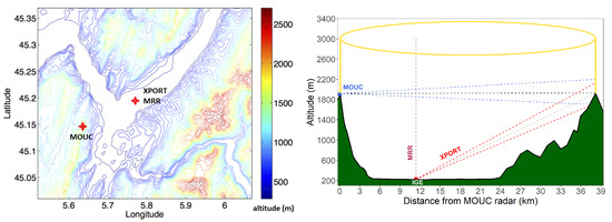 Grenoble Experiment: Instrument Setup. The topographical map of Grenoble along with positions of two radar systems is shown in the left and the cross-section of the scan volume passing through XPORT and MOUC radars is shown in the right.