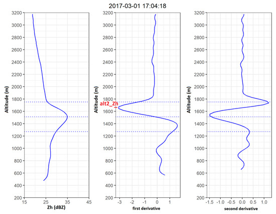 Figure 3 illustrates the working principle of the ML detection algorithm based on computation of the first and second derivatives of the QVP, a Zh QVP in that case. The “bright-band” peak corresponds to max(Zh) in the vertical profile, a first derivative equal to 0 and a minimum value of the second derivative. The bright band top and bottom correspond to the maximum values of the second derivative. The minimum of the first derivative of the reflectivity profile was found to be a distinctive figure for the reflectivity profiles: large peak value and altitude (alt2_Zh) located in between top and peak of the bright band. This altitude (alt2_Zh) is used as an initial guess for the ML position in the vertical.