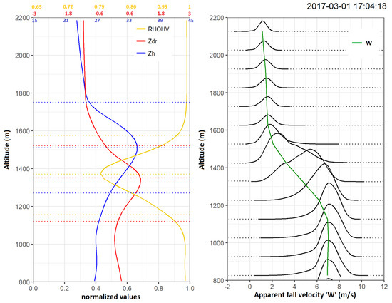 - Vertically pointing MRR provides vertical profile of hydrometeor’s apparent fall velocity spectra(S(v)). The Doppler spectrum is the power-weighted distribution of radial velocities within the resolution volume, i.e., represents the power returned to the radar by scatterers with radial velocity between v and . The average radial velocity (W) is the first moment of the normalized Doppler spectrum, and spectral width is the square root of normalized second moment. Spectral width is a measure of dispersion of velocities within the resolution volume. Unlike other radar observables, average fall velocity has a monotonously decreasing vertical profile (with increase in elevation) within the ML. Above ML, snow has average fall velocity of 1–2 m/s; presence of crystalline ice, super cooled water and air updrafts/downdrafts can affect the average fall velocity of snow. Towards the end of 3rd stage of melting, hydrometeors smoothen causing decrease in aerodynamic drag and slight increase in fall velocity. During the 4th stage of melting, as hydrometeor melt fraction increases, its density increases and it assumes more spherical shape (size decreases), which also aids to decrease aerodynamic drag and to increase fall velocity. As the largest hydrometeors melt completely and become spherical rain drops, the average fall velocity reaches a maximum. As the raindrops continue to fall, they might assume oblate shape resulting in a slight decrease of the fall velocity to reach the terminal velocity of 6–8 m/s. At low rainfall intensities raindrops are small and remain mostly spherical and this decrease might be negligible, like in Figure 4. Some ML detection algorithms (like [36]) use the altitude of maximum average velocity as the bottom of ML. At the altitude of Zh peak, the average fall velocity is still close to fall velocity of snow. The Doppler velocity spectra is very narrow above and below ML, centered at terminal velocity of snow and rain respectively. Within the melting layer, the spectral width broadens gradually with decrease in , reaches maximum value at altitude with minimum , and it contracts again with increase of .