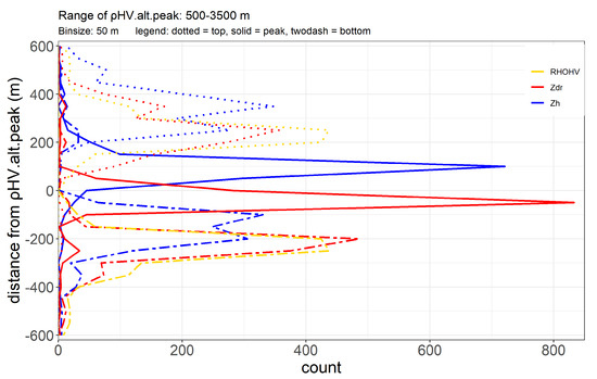 Pdfs of distances (binned with width of 50 m) of different radar signatures in ML with respect to peak altitude.