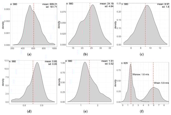 Pdf plots of some ML characteristic value; dotted red lines indicated the mean value. Limits of the plots are set at . (a) ML width (m); (b) Zh.val.bot (dBZ); (c) Zh.val.t2p (dBZ); (d) .val.peak; (e) Zdr.val.p2b (dB); (f) Mean Fall velocities (m/s).