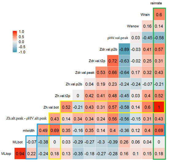 Using partial correlation coefficients in Figure 7, we computed the total correlation coefficients (Appendix A.2) of different ML characteristic values as explained variables (index 1) as a function of the two explanatory variables (ML top and R). The most interesting results are displayed in Table 6. First we note that ML top is poorly correlated with R in correlation matrix Figure 7 ( = 0.18). This is desirable, as the addition of second explanatory variable promises new information, potentially adding value in the explanation of variable of interest with respect to the first explanatory variable. The added value can be quantified by comparing the total correlation coefficient with the absolute value of highest partial correlation coefficient or . We found that there is actually little or no added-value with the second variable most of the time, e.g., for Zh.val.t2p in Table 6, but also for Zh top value, Wsnow and Wrain. However, there is a significant improvement on and Zdr observations, i.e., +6 points improvement in explanation of peak and +12 points improvement in explanation of Zdr enhancement at the bottom of the profile (Zdr.val.p2b), +11 points improvement in explanation of the altitude difference between the peak and the Zdr peak values. As visible in Table 6 and equation in Appendix A.2, such gains in correlation are significant when and are of opposite sign, being positive. The physical interpretation of such statistics is not trivial, but they do draw our attention towards the complex interplay of melting processes on polarimetric radar observables.