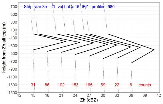 - With aggregation as the dominant process, from 1000 m above the ML, there is an increase in radar reflectivity (Zh, Zv) of 6 to 7 dBZ, as observed in Figure 3 and Figure 4, with little dependence on precipitation intensity, consistent with [14]. Small snowflakes melt faster than the big ones, causing some particles to fall faster than others and thus increasing probability of aggregation and coalescence. In an atmospheric column with steady precipitation, assuming stationarity, this leads to an increase in the particle size (in case of aggregation) or an increase in number density (if no aggregation) at a layer lower than the initial level. This leads to steady increase in Zh below initial 0 °C isotherm. When most big particles are at end of 3rd stage of melting, i.e., with thin shell of meltwater with ice-core, they essentially have size of the ice-particle and di-electric constant of water. These few large highly reflective particles, resembling big raindrops to a radar, explain the maximum of the reflectivity profile; around 10 dBZ bigger than the value at ML top for the example of Figure 3 and Figure 4. The bright band peak is said to occur at a level where the particles have attained the high scattering property of water drops but have not yet attained their velocity [31]. As these big particles start to melt and gain higher falling velocities, the number concentration at the given altitude of the atmospheric column decreases. This causes a gradual decrease in reflectivity in the lower portion of ML (below thw altitude of Zh peak); reflectivity remains more or less constant below the ML.