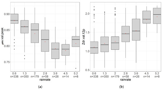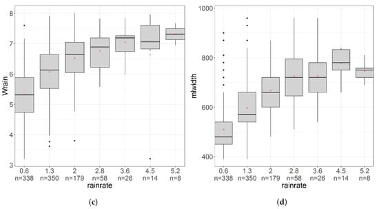 Box-plots of different ML descriptors as a function of the rainrate. For each rainrate class, upper and lower hinges corresponds to 25 and 75 percentiles respectively; black line inside the box is the median and red-cross is the y-mean. The number of observations in each interval is shown below corresponding x-label. (a) .val.peak vs. rainfall intensity (); (b) Zdr.val.t2p (dBZ) vs. rainfall intensity (); (c) Wrain () vs. rainfall intensity (); (d) ML width (m) vs. rainfall intensity ().