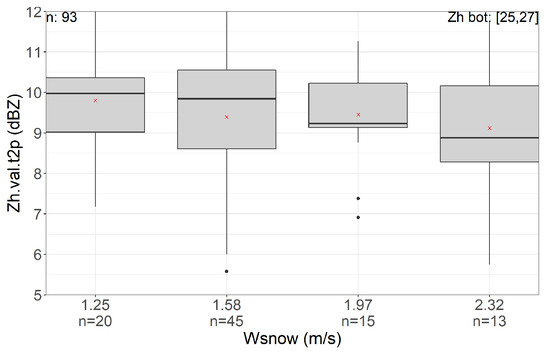 In order to check if this effect is visible in our dataset, in Figure 10 we examine the effect of snow density on BB enhancement. As most of the events under study are stratiform events with max rainfall intensity of 8.47 , we do not have significant number of observations at the last interval i.e., mean(Wsnow) > 2.3 as seen in Figure 10. For a small class of reflectivity values below ML, [25–27 dBZ], we observe a decrease in BB enhancement of 1 dBZ with the increase in snow velocity/density.