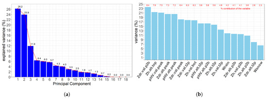 Principle Component Analysis: Explanation of total variance of the dataset. (a) Total Variance: PCs Contribution; (b) Total Variance: Variable Contribution.