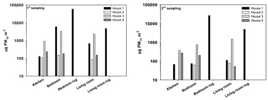 Huge differences in dust loadings between rugs and hard floorings were registered (Figure 1). Rugs represented the surface with the highest dust loadings. In general, higher dust loadings were observed for parquet flooring as compared with tile. Among the four dwellings, the highest dust loadings were obtained in the living room of a suburban family house with an open fireplace. Several factors can affect the surface dust loadings, such as walking, cleaning frequency, household materials, and indoor particle sources. Thus, the presence or absence of occupants can have a marked effect on resuspension levels. In house 1, for example, a very significant decrease in dust loadings from the first to the second week was registered, possibly due to the absence of owners for a few days. The highest mean value was observed in bedrooms (1745 µg PM10 m−2), followed by living rooms (785 µg PM10 m−2) and, finally, kitchens (297 µg PM10 m−2). The size distribution of aerosols emitted from cooking activities has been reported to be dominated by ultrafine particles, with modes generally in the range of 20–100 nm [58]. Thus, although cooking emissions can be high and contribute to the deposition and subsequent resuspension of dust, nanometer sizes represent a small fraction of the particulate mass. Dust loadings in the kitchen of house 3 were two to seven times higher than in the kitchens of other houses. This may be due to a higher utilization rate. In the other three residences the owners, in general, only prepare dinner. A higher mean value for bedrooms may be related to the presence of specific active sources or activities in this space of the house, such as making and unmaking the bed, dressing and undressing (which potentiates skin desquamation), existence of various rugs, use of cosmetics, etc. [59].