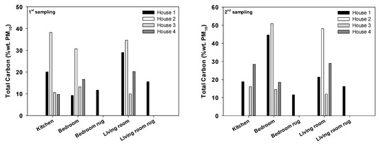 Total carbon accounted for 9.3 to 51 wt% of PM10 with the highest mass fractions recorded in dust samples collected in the city center apartment (Figure 2). More than 80% of the total carbonaceous matter was composed of OC, whereas in many samples the EC was too low or undetectable. The highest percentages of EC (10% to 20% of total carbon) were observed in kitchens, where there are sources of combustion. The high proportion of OC reflects the importance of a multitude of indoor sources that contribute to the organic carbonaceous component of household dust, including bacteria, skin flakes, cosmetics, cleaning products, cooking, paper and clothing fibers, microscopic specks of plastics, environmental contaminants brought on the soles of our shoes, etc. Our finding that a large portion of PM10 from indoor dust is composed of OC agrees with the results of Polidori et al. [69], who measured particulate OC and EC concentrations at 173 homes in the USA. These authors demonstrated that part of the OC can be secondarily formed in the indoor environment as a result of reactions involving gas-phase organic compounds emitted by cleaning products, air fresheners, and other sources.