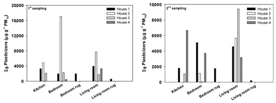 Eight phthalate plasticizers (PAEs) and one non-phthalate plasticizer [bis(2-ethylhexyl) adipate, DEHA] were quantified in PM10 from settled house dust. PAEs included dimethyl phthalate (DMP), dimethylpropyl phthalate (DMPP), diethyl phthalate (DEP), diisobutyl phthalate (DIBP), di-n-butyl phthalate (DBP), di-n-hexylphthalate (DNHP), benzyl butyl phthalate (BBP), dicyclohexyl phthalate (DCHP), bis(2-ethylhexyl) phthalate (DEHP), di-n-octyl phthalate (DNOP), di-isononylphthalate (DINP), and di-isodecylphthalate (DIDP). The total mass fractions varied from 5 µg g−1 to 17 mg g−1 PM10 (Figure 3). As observed with dust loads, huge differences were observed from week to week and from home to home. The highest values were registered in the bedroom of the city center apartment and in the living room of the rural house. In addition to variability in sources, the concentrations of these compounds depend on the same factors already mentioned for the dust loads (e.g., ventilation, domestic routines, and cleaning activities). Widely scattered concentration levels were also documented in many previous works. For example, Kubwabo et al. [33] analyzed 17 PAEs in 126 Canadian household dust samples, evidencing the huge variability in spatial and temporal distribution of these compounds across different areas of the home, and thus the difficulty in predicting potential household exposures.