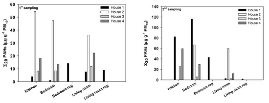 As compared with plasticizer compounds, PAHs accounted for a much smaller mass of household dust (Σ20PAHs 0.98 to 116 µg g−1 PM10). Given the small number of samples and the variability in concentrations, it is difficult to infer patterns between house or room typologies (Figure 4). The values obtained in this study fall into the broad range of values reported in the literature. Wang et al. [22] analyzed 15 PAHs in settled house dust of urban dwellings with preschool-aged children in Nanjing, China. ∑15PAHs ranged from 1.2 to 280.4 µg g−1, averaging 11.1 µg g−1. Yadav et al. [85] investigated the contamination level of EPA′s priority PAHs in indoor dust from residential, educational, commercial, public places, and office premises, in four major cities of Nepal. Concentrations of ∑16PAHs ranged from 747 to 4910 ng g−1 (median 1320 ng g−1). In Palermo, Italy, Mannino and Orecchio [86] collected indoor dust samples by brushing from surfaces at a height of 1.5 to 2.0 m above ground level in bedrooms, living rooms, kitchens, laboratories, offices, in a market, and in a car. The ∑16PAH concentrations were within a broad interval (36 to 34,453 µg g−1), with an average of 5111 µg g−1, indicating heterogeneous levels of contamination in the investigated microenvironments. Organic extracts of sieved vacuum cleaner dust from 51 homes in Canada were examined for the presence of 13 PAHs [87]. Total concentrations varied between 1.5 and 325 µg g−1 with a geometric mean of 12.9 µg g−1. These values were found to be comparable to those documented in a previous review in which the total PAHs in samples collected from urban, rural, and suburban homes ranged between 0.4–544 µg g−1 with a geometric mean of 4.5 µg g−1 [7]. High concentrations of ∑16PAHs were also observed in indoor dust samples collected across China from 45 private domiciles and 36 public buildings (1.00 to 470 µg g−1, mean value of 30.9 µg g−1) [88]. It must be noted, once again, that comparability between results of various works should be made with caution, as they concern different surfaces, particle sizes, sampling and analytical methodologies, and list of compounds.