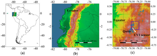 Figure 1. Location of: (a,b) Ecuador; (c) Quito, and the ultraviolet radiation index (UVI) sensor. Dashed lines show part of the TEMIS grid for the UV index. The blue square is the cell (column 406, row 360) holding the UVI sensor.