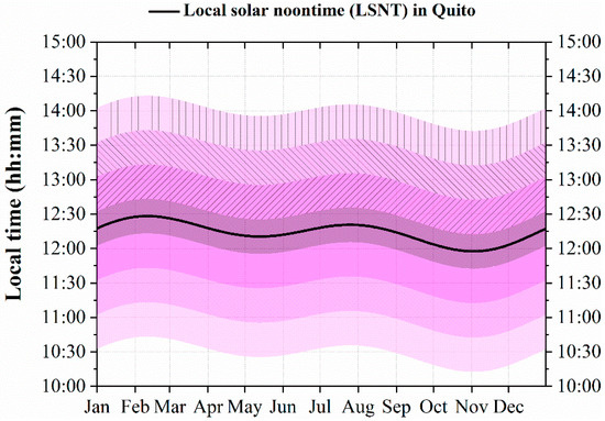 Using the NOAA Solar Calculator [21], we obtained the local solar noontime in Quito during the yearly cycle (Figure 2), which varies between 11:57 (November) and 12:28 (February).